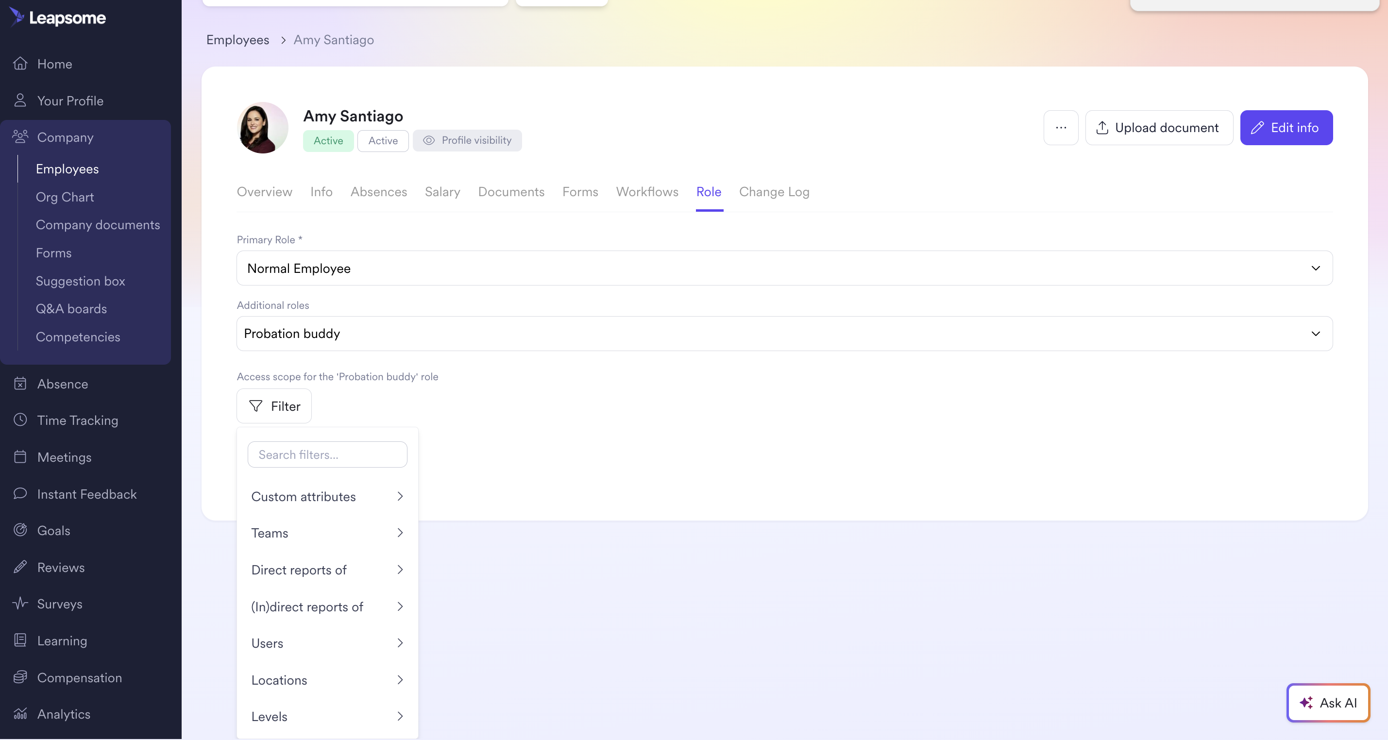 User-scoped permissions enable administrators to create highly customized access control systems that provide granular control over individual user permissions within Leapsome. This advanced feature allows for precise management of who can access what, ensuring security, compliance, and optimal resource allocation.