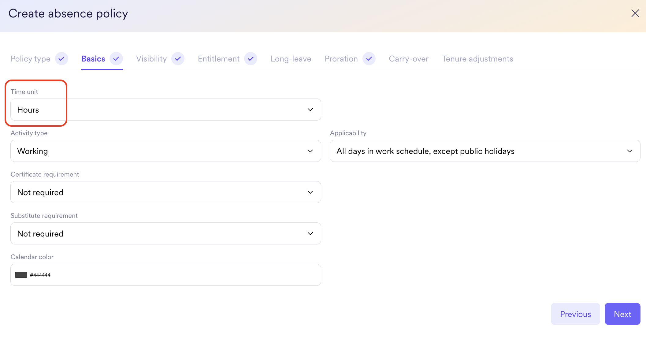 - The absence policy unit is set to hours (not days)