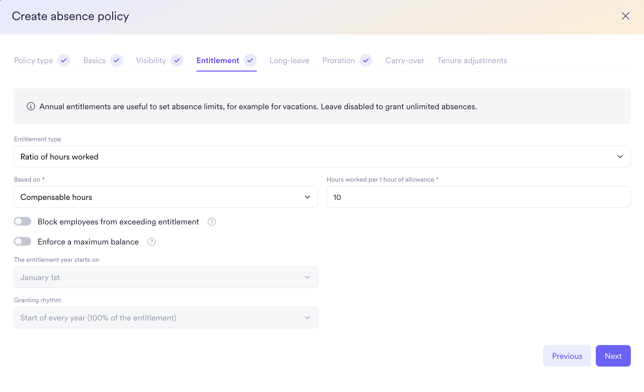 - Block employees from exceeding entitlement: Enable to prevent negative balances