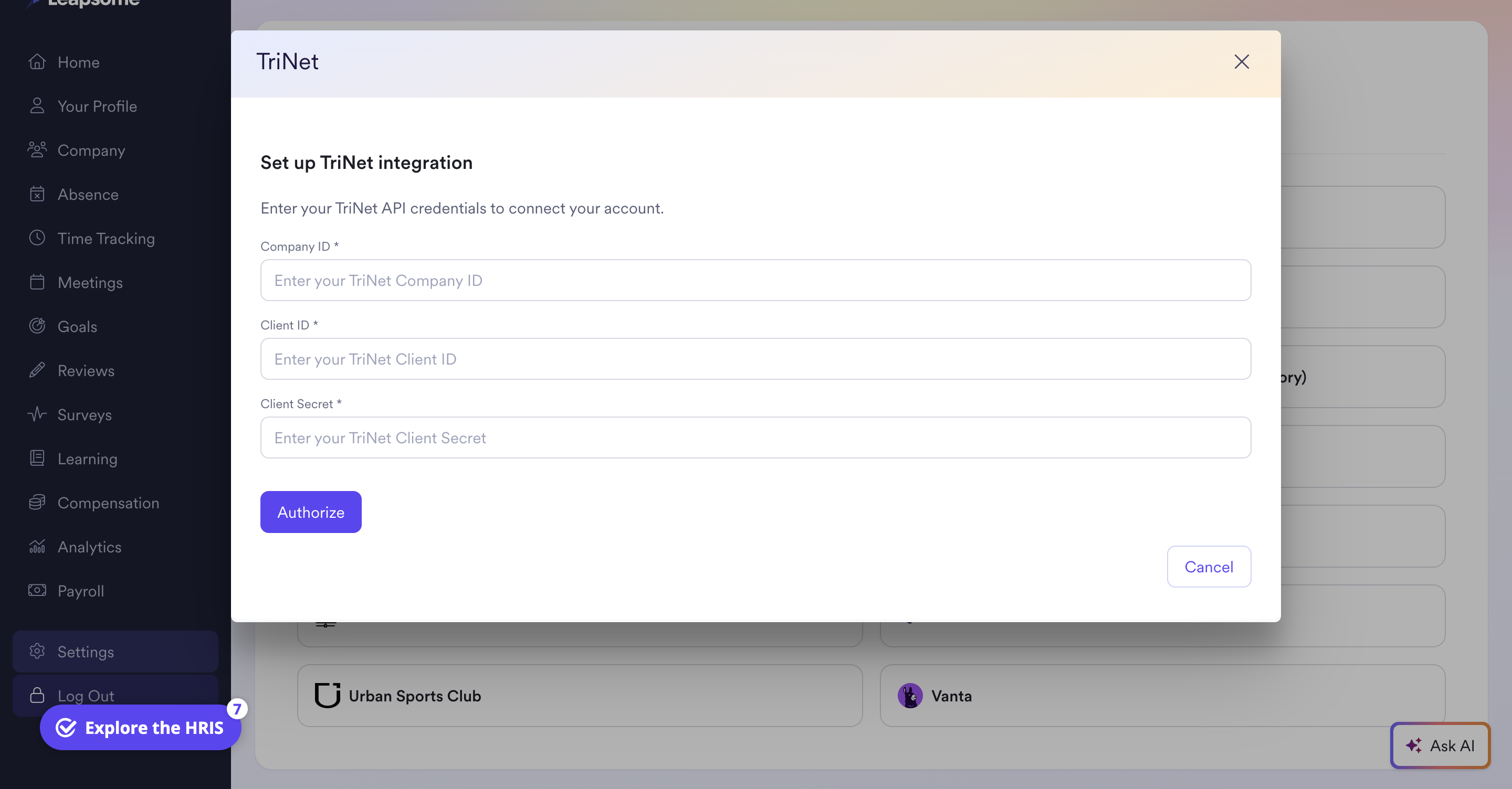 - Admin access: You must have 'Super-admin' permissions in Leapsome and 'Full Admin' (or API-specific) access in TriNet.