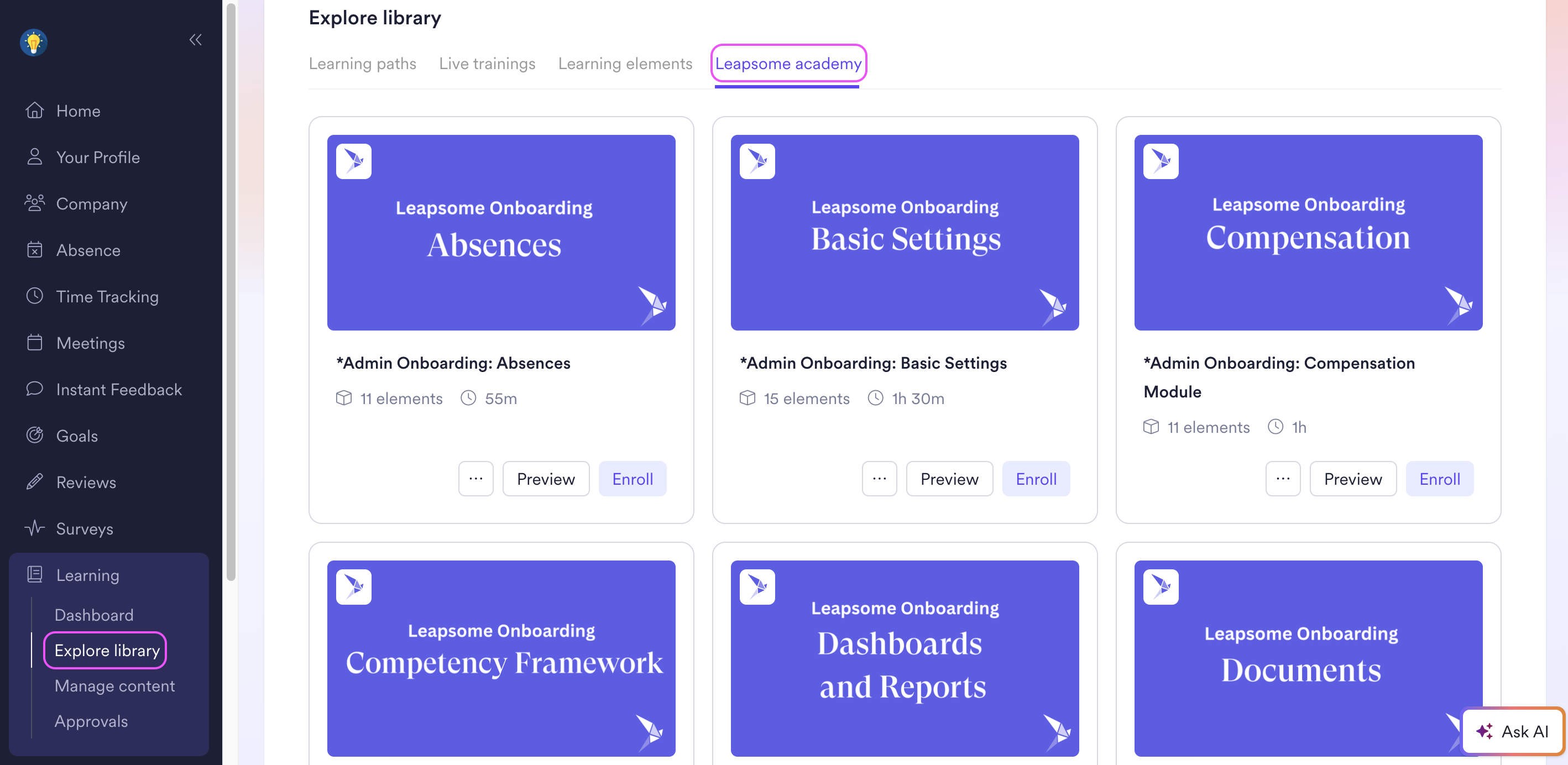 - Click on 'Explore library' > 'Leapsome Academy'