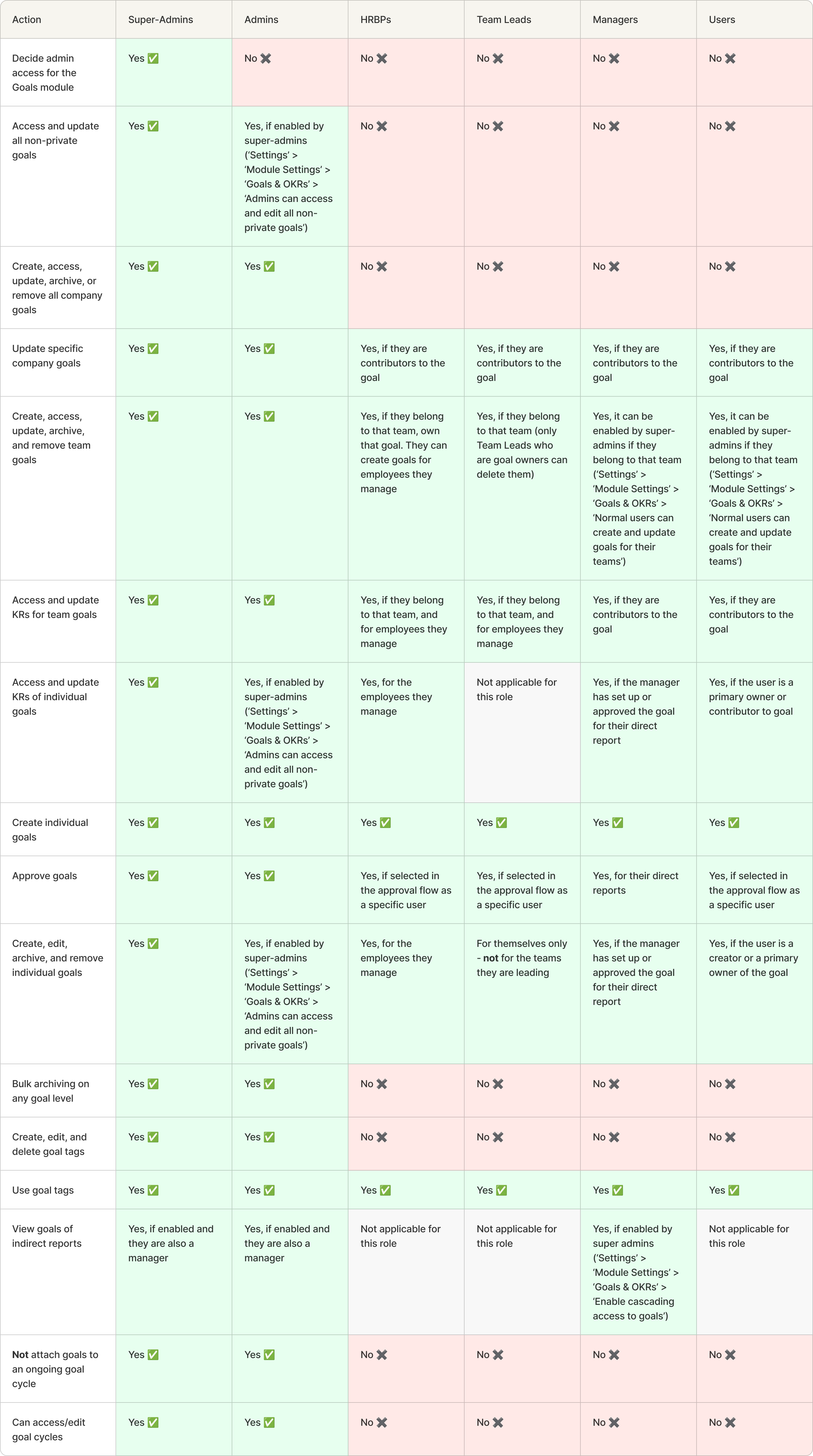 The Matrix below will give you an overview of the Goals & OKRs visibility and access rights of (super) admins, team leads, managers, and users. More information on the visibility and access rights of 'additional managers' can be found in this article.