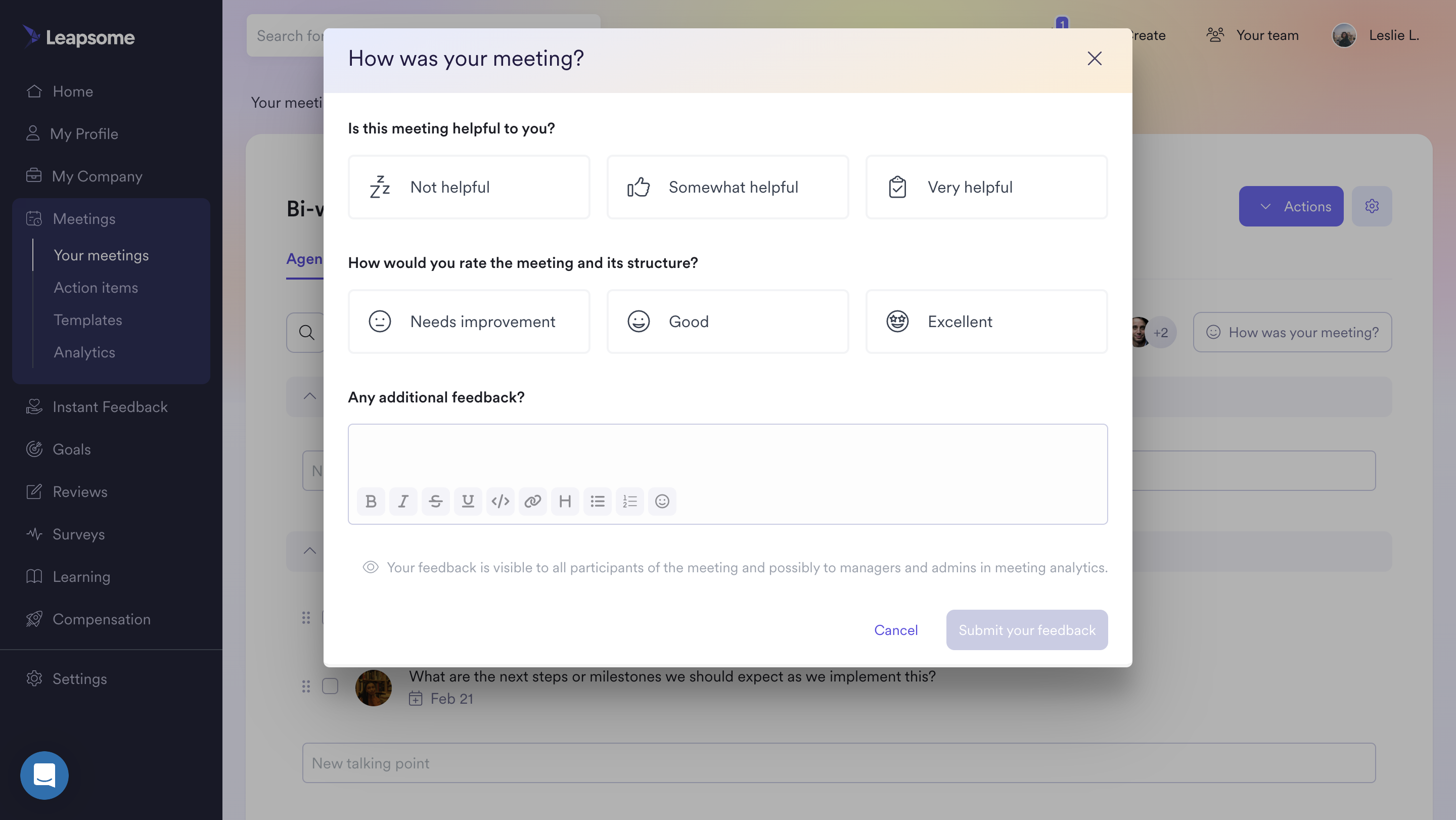 Using the 'How was your meeting?' tab, participants can give feedback and anonymously score the helpfulness of the meeting. The feedback is visible to all participants of the meeting and possibly to managers and admins in meeting analytics. A meeting rating remains anonymous and comments and written feedback are non-anonymous.