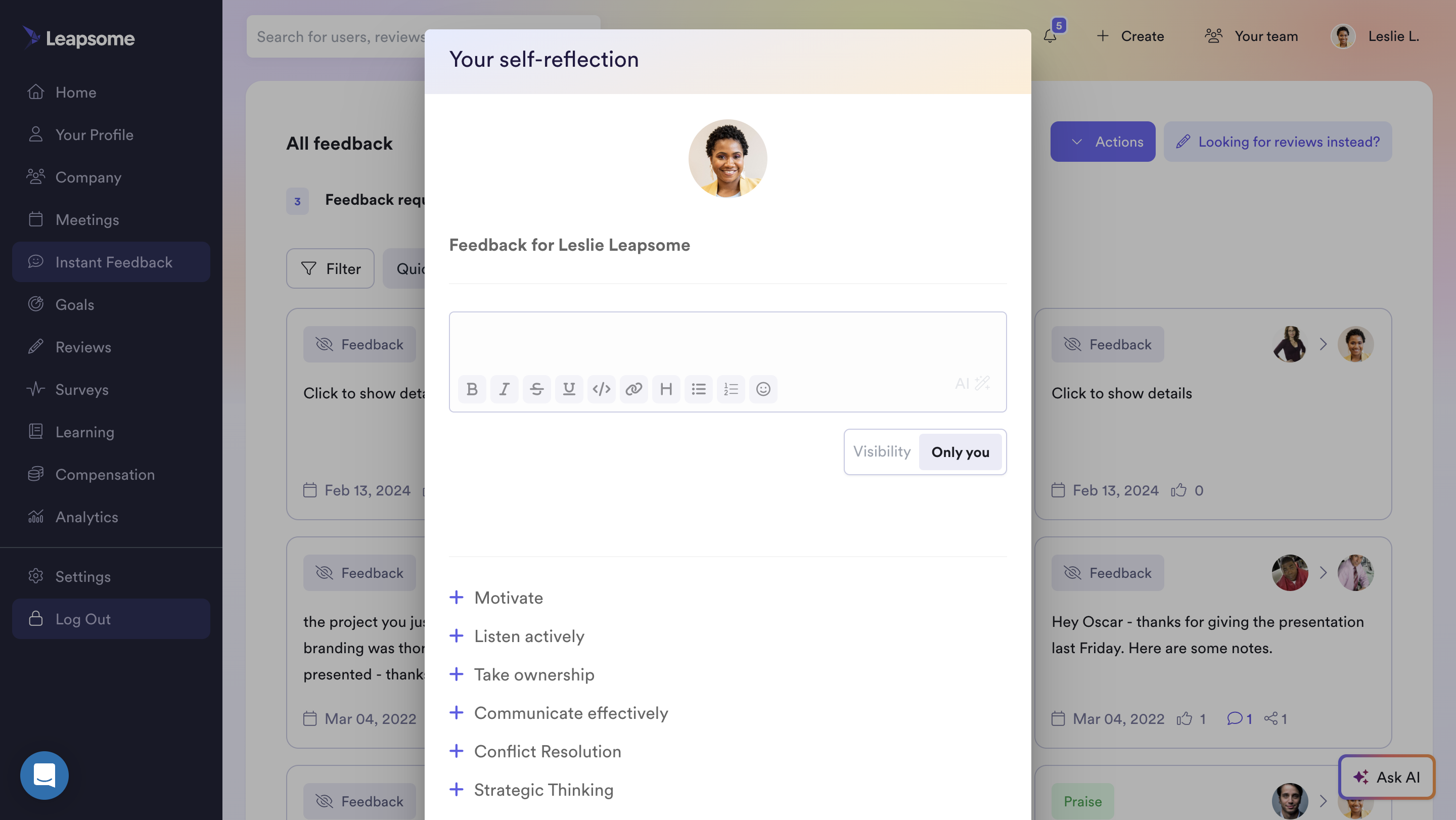 From a personal development perspective, it is very helpful to understand these differences in perception. A self-evaluation on Leapsome guides you through the structured questions that your colleagues would see when giving you feedback. It allows you to answer these questions yourself. On your profile, you can see these differences in perception visually highlighted.