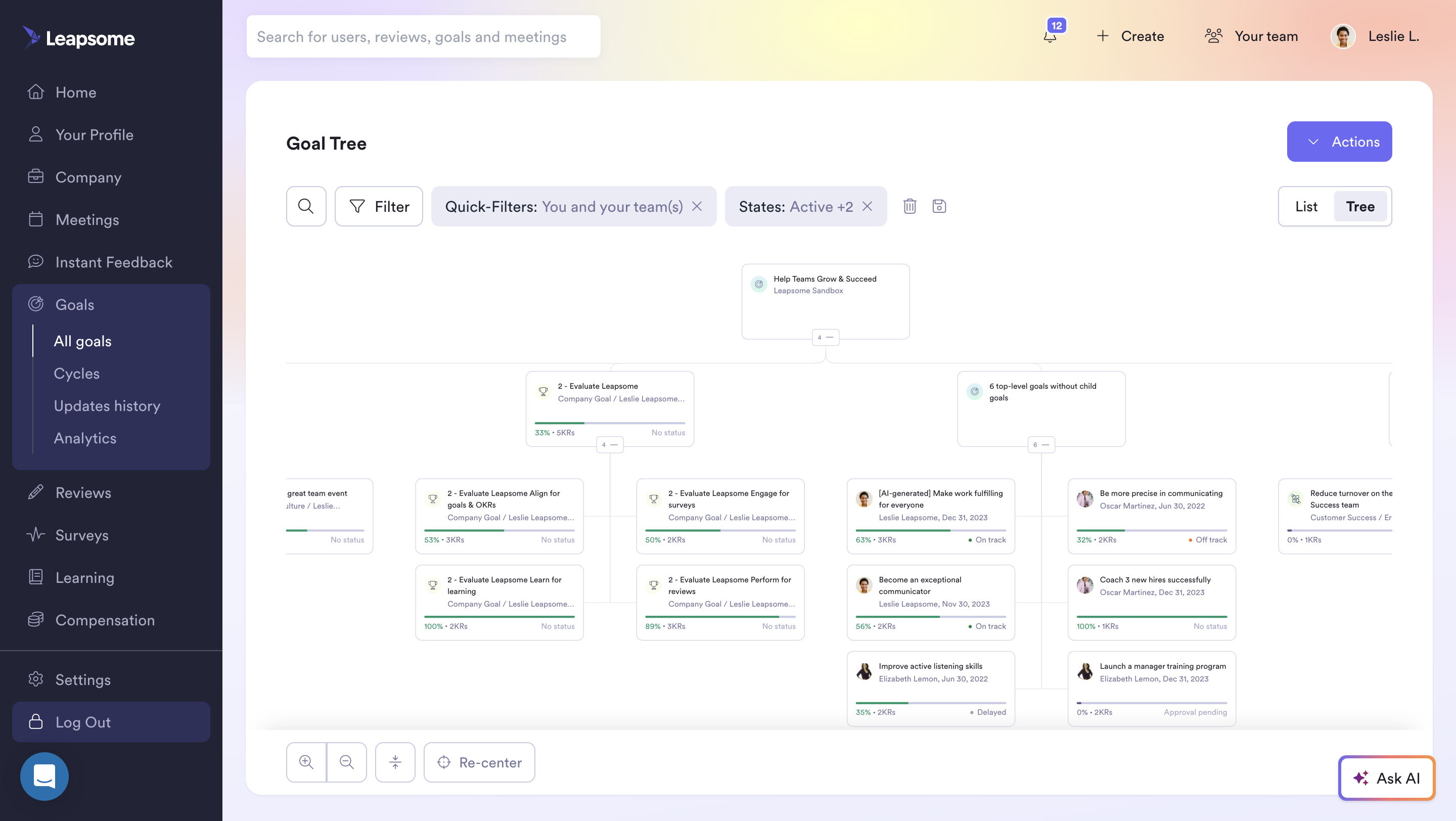Another differentiation between goals and OKRs is alignment and transparency. A team OKR should be aligned to the company OKR, and an individual OKR should be aligned to a team OKR to support a strategic approach. This is how you align the whole company behind your mission. The alignment can easily be visualized within the Leapsome module by creating a goal tree. Leapsome can help you visualize your goal alignment and increase the transparency of your company’s progress and direction.