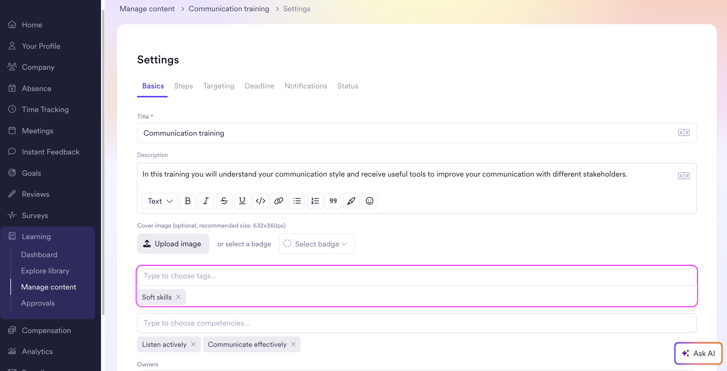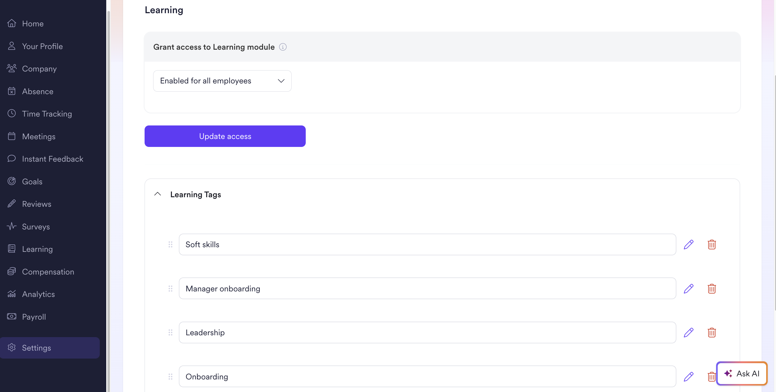 In 'Settings' > 'Module & feature settings' > 'Learning', you can use the 'Learning Tags' section to create an unlimited number of appropriate tags.