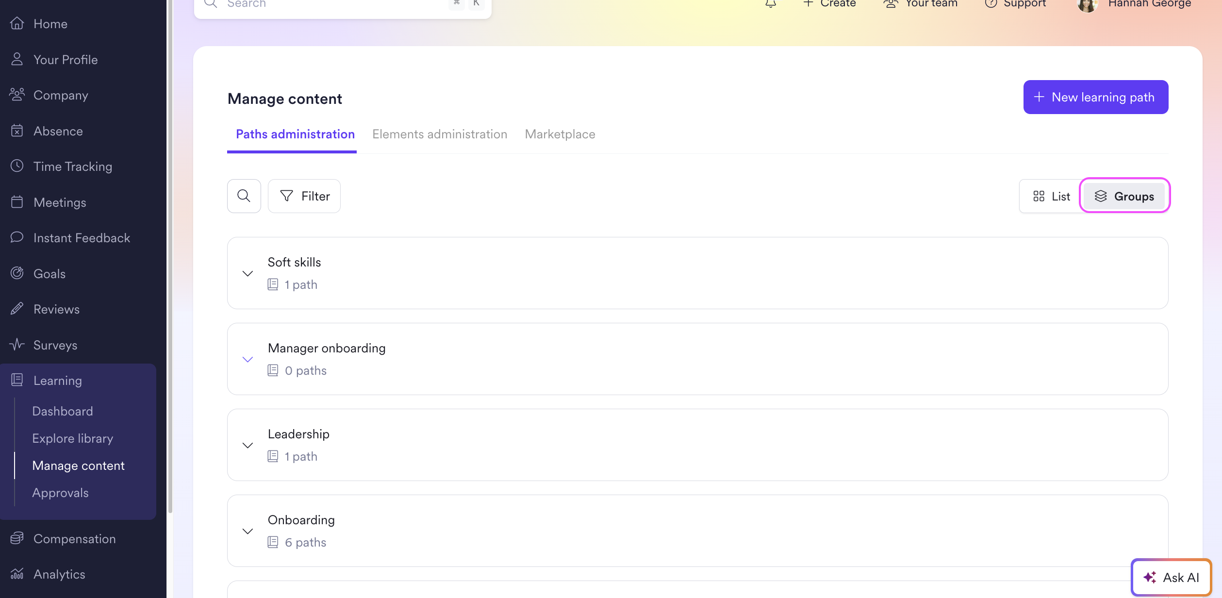 Learning paths are built using Learning elements; you can also add a tag for each learning element. When creating a new learning element, you’ll have the option to choose a tag underneath the description. Paths and elements with tags assigned to them will be grouped into folders, to switch to that view click on the 'Groups' view.