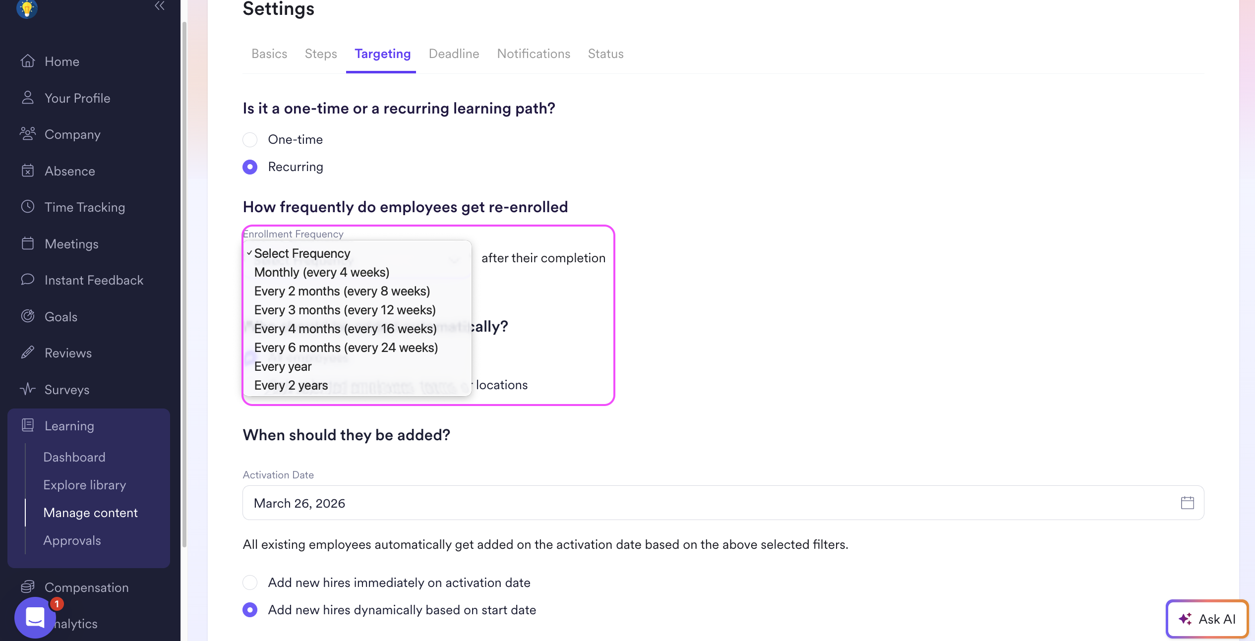 When creating a learning path, you can target whether the path will be a one-time occurrence or recurring at a specified frequency. All other steps in setting up a learning path can be found in Creating Learning Paths.