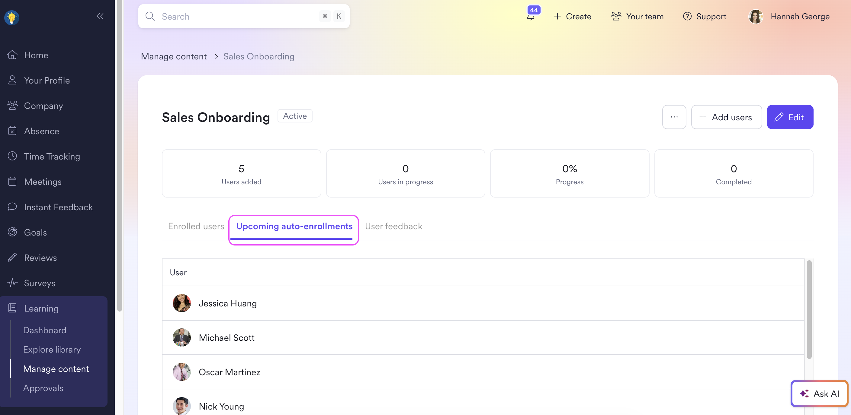 When users will be added to a Learning Path in the near future, you will also see their names appear under the 'Upcoming auto-enrollments' tab, within the Learning Path dashboard. Users will be removed from this list the day of being added, and there may be a time delay between them getting removed from the soon-to-be-added list, and added to the actual participation list.