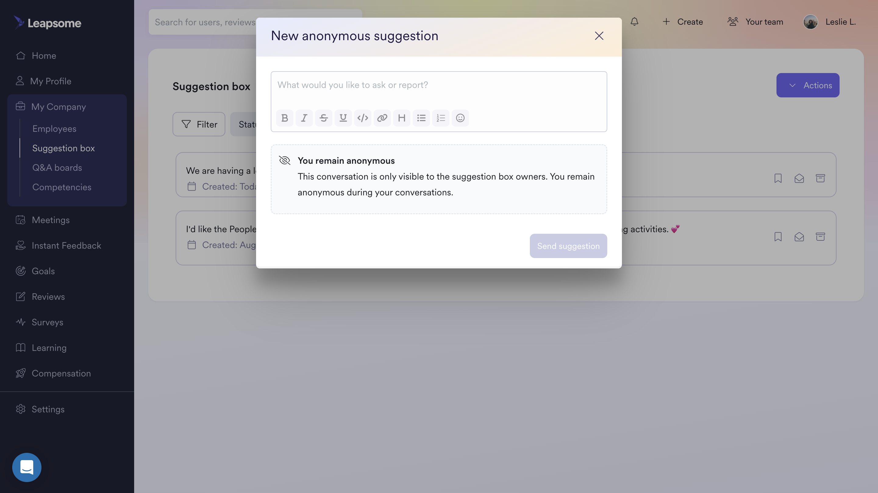 Your company may enable an anonymous suggestion box for you to provide suggestions or feedback directly to the super admins or selected owners of the anonymous suggestion box. This feedback would be entirely anonymous to the receiver and will not be visible to anyone in the company except to the super admins and/or selected owners.