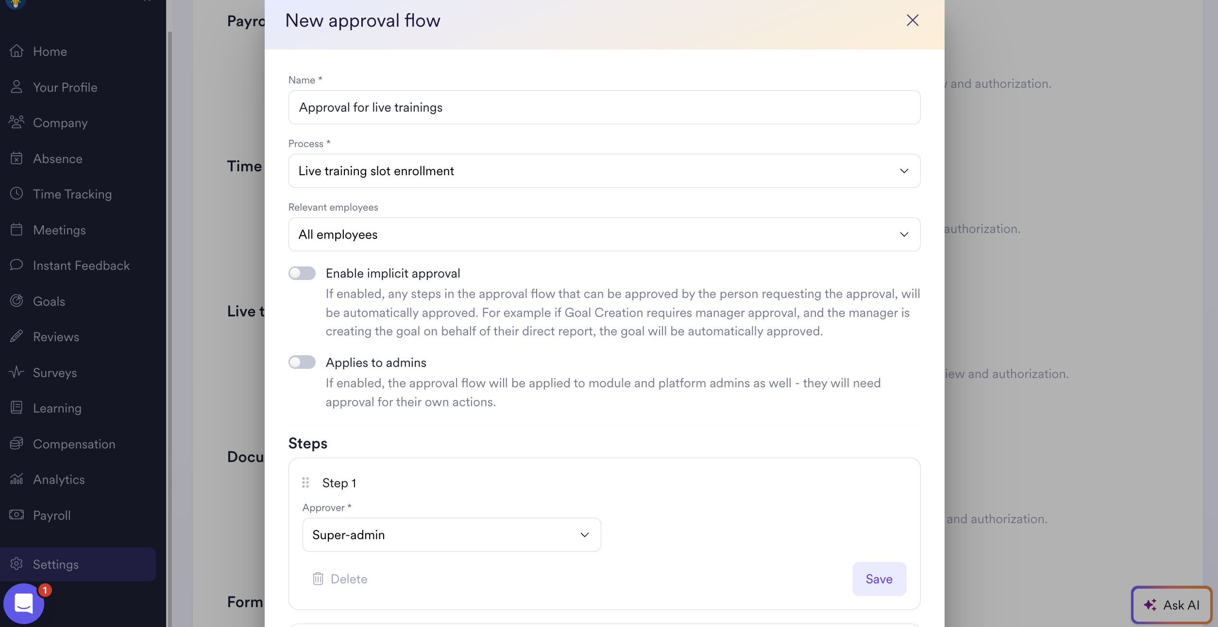 To create an approval flow, navigate to 'Settings' > 'Automations' > 'Approvals' > 'Live Training Slot Enrollment' and click on 'New approval flow'. In the pop-up window, you can select the new approval flow's: