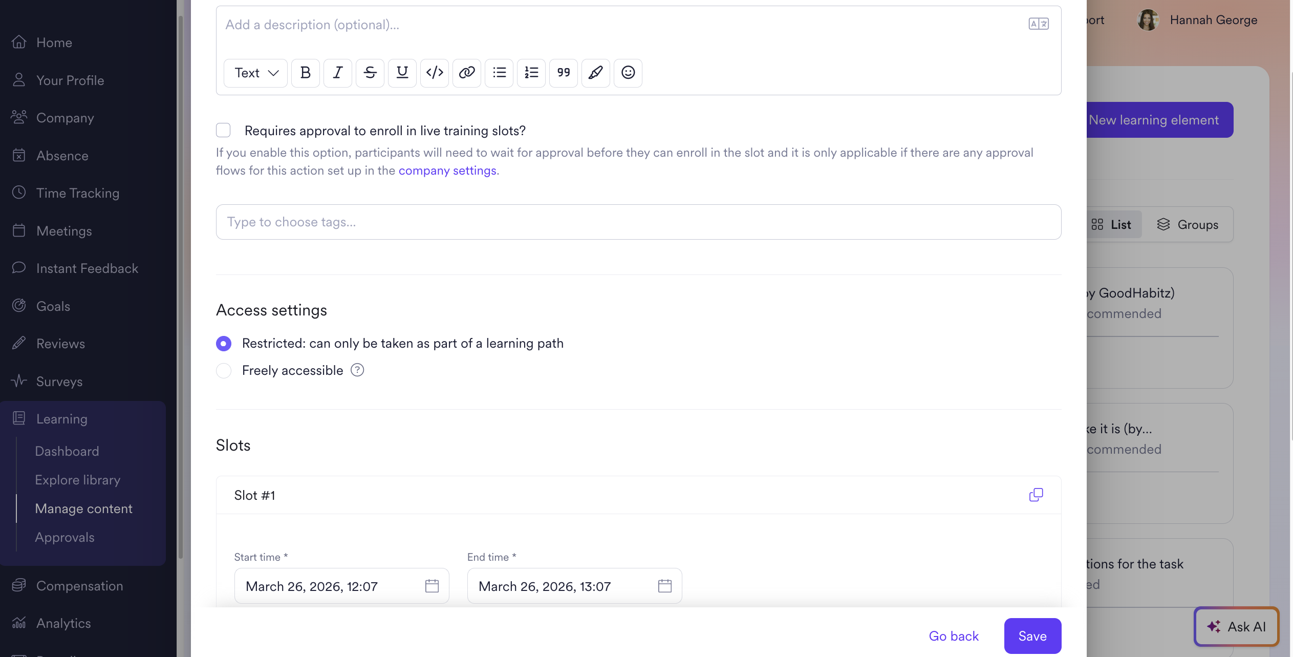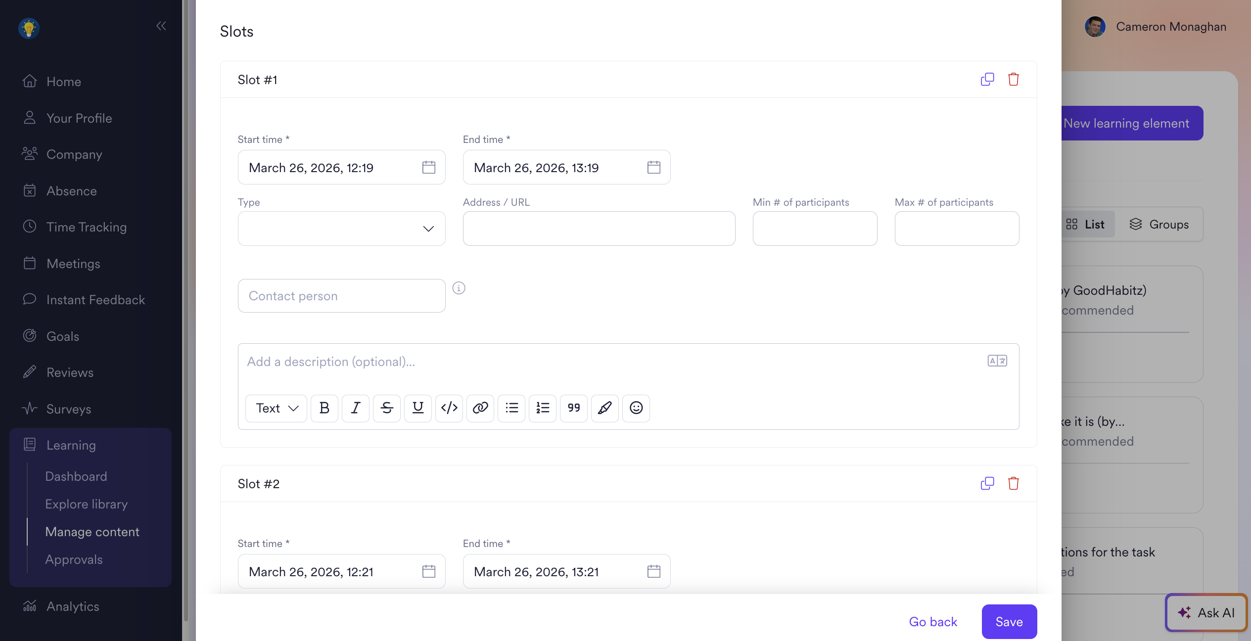 - Description: Different slots under the same live training can have different requirements, instructions, expectations and more. Admins can customize each slot by adding a description with any relevant details for the different slots.