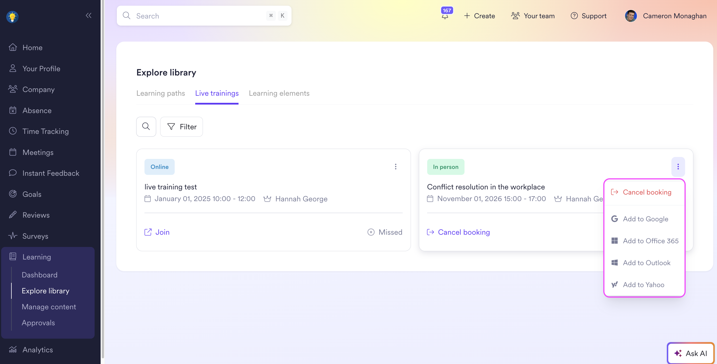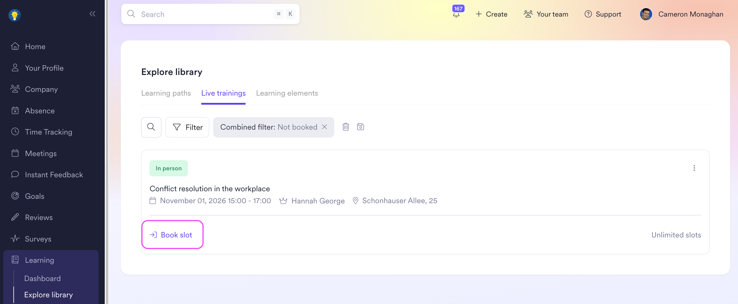 All live training you have booked or want to book can be found in the sub-menu tab 'Explore library' in the Learning module. In the 'Live trainings' tab, you will find the following: