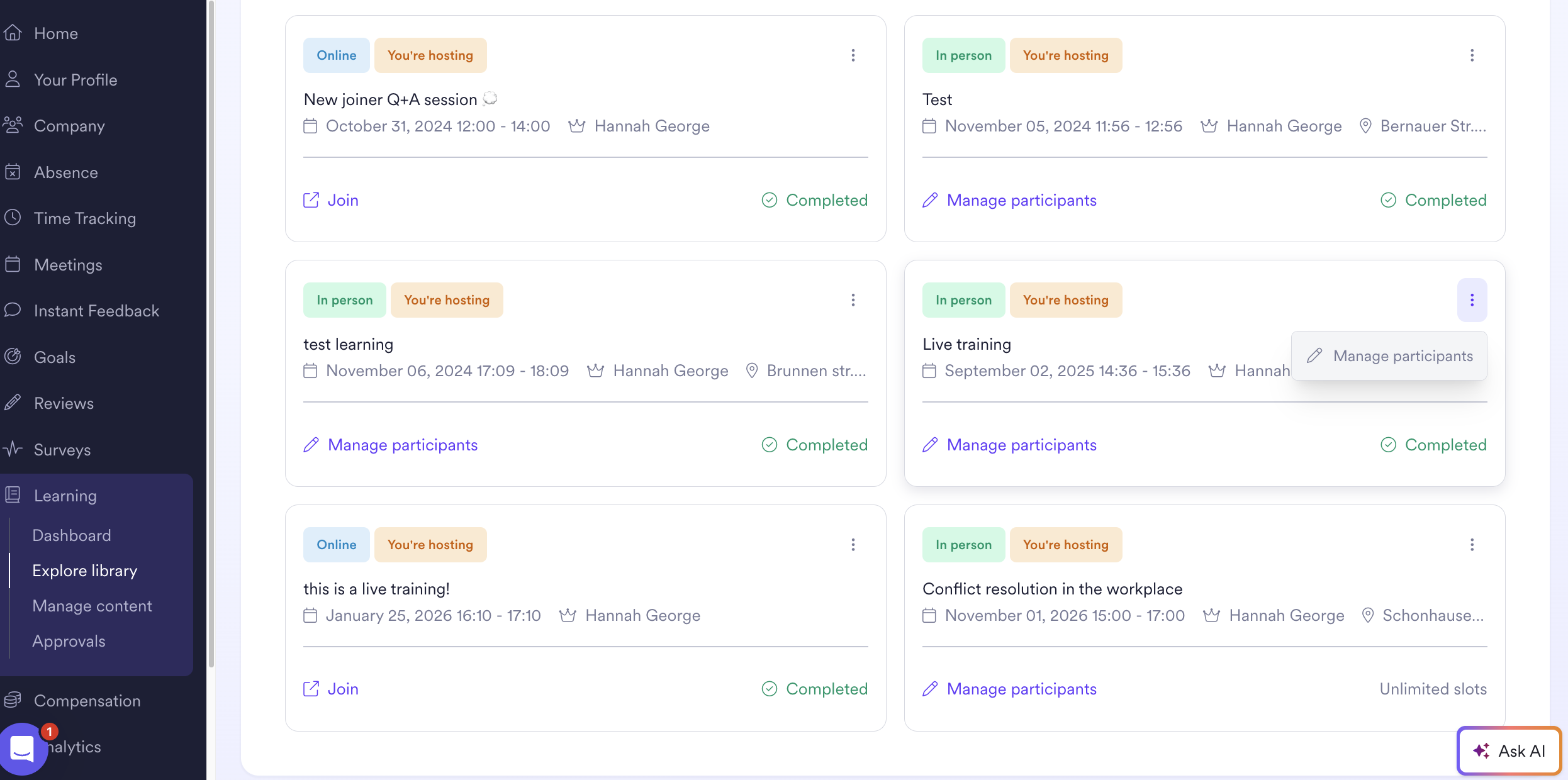 Head to 'Explore library' > 'Live Trainings' > click 'Manage participants' or click on the three vertical dots of the relevant live training > 'Manage participants'.