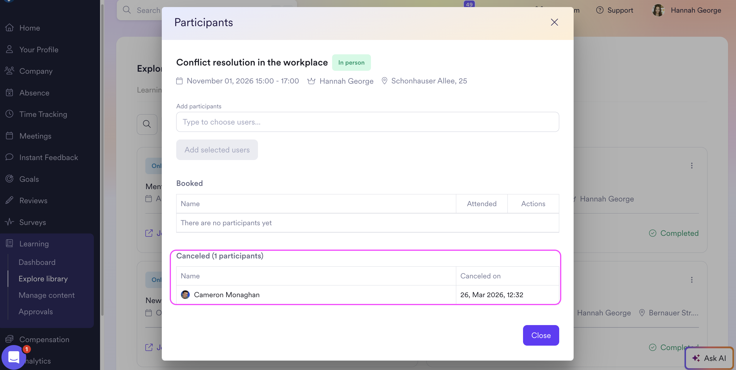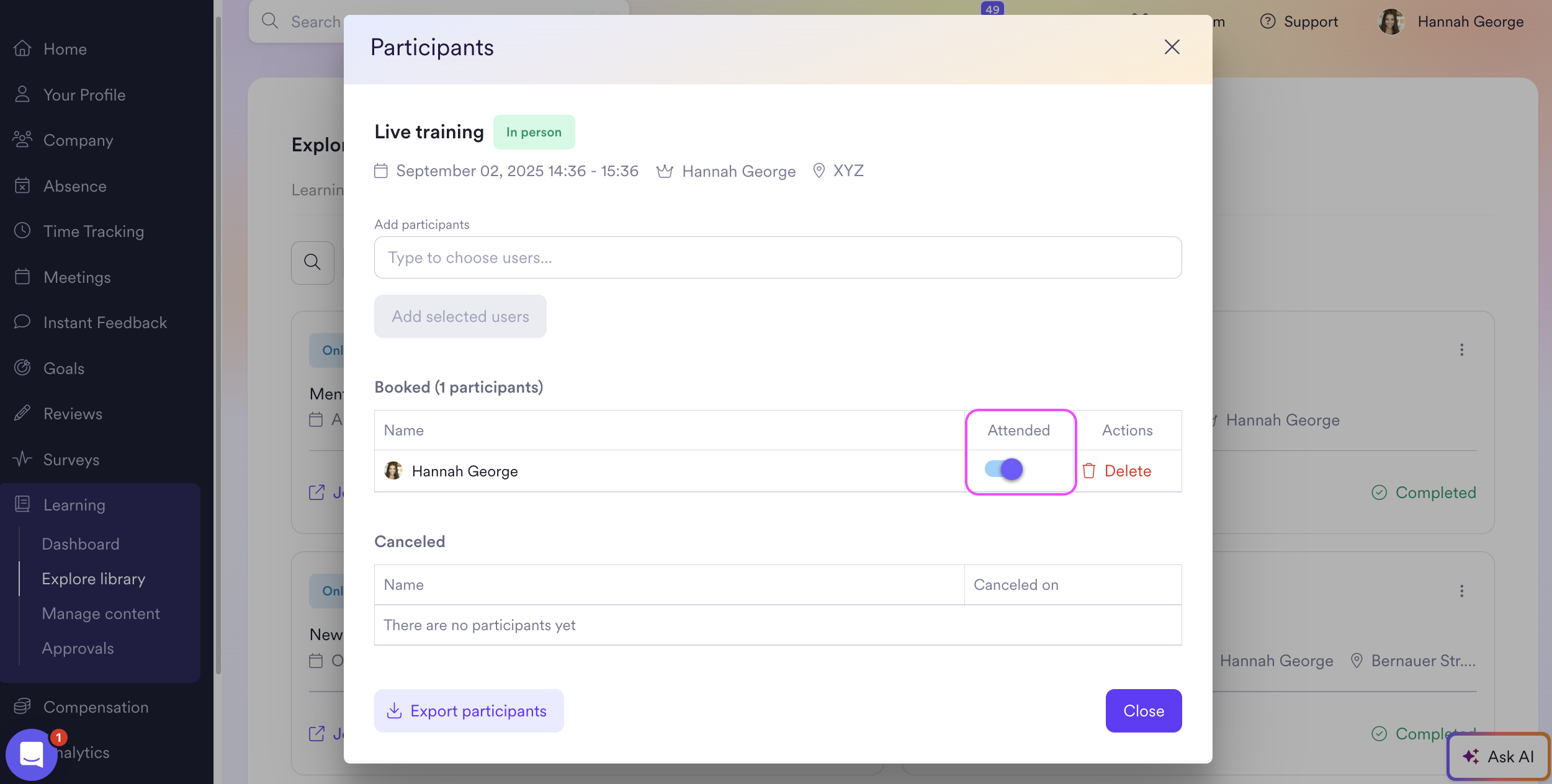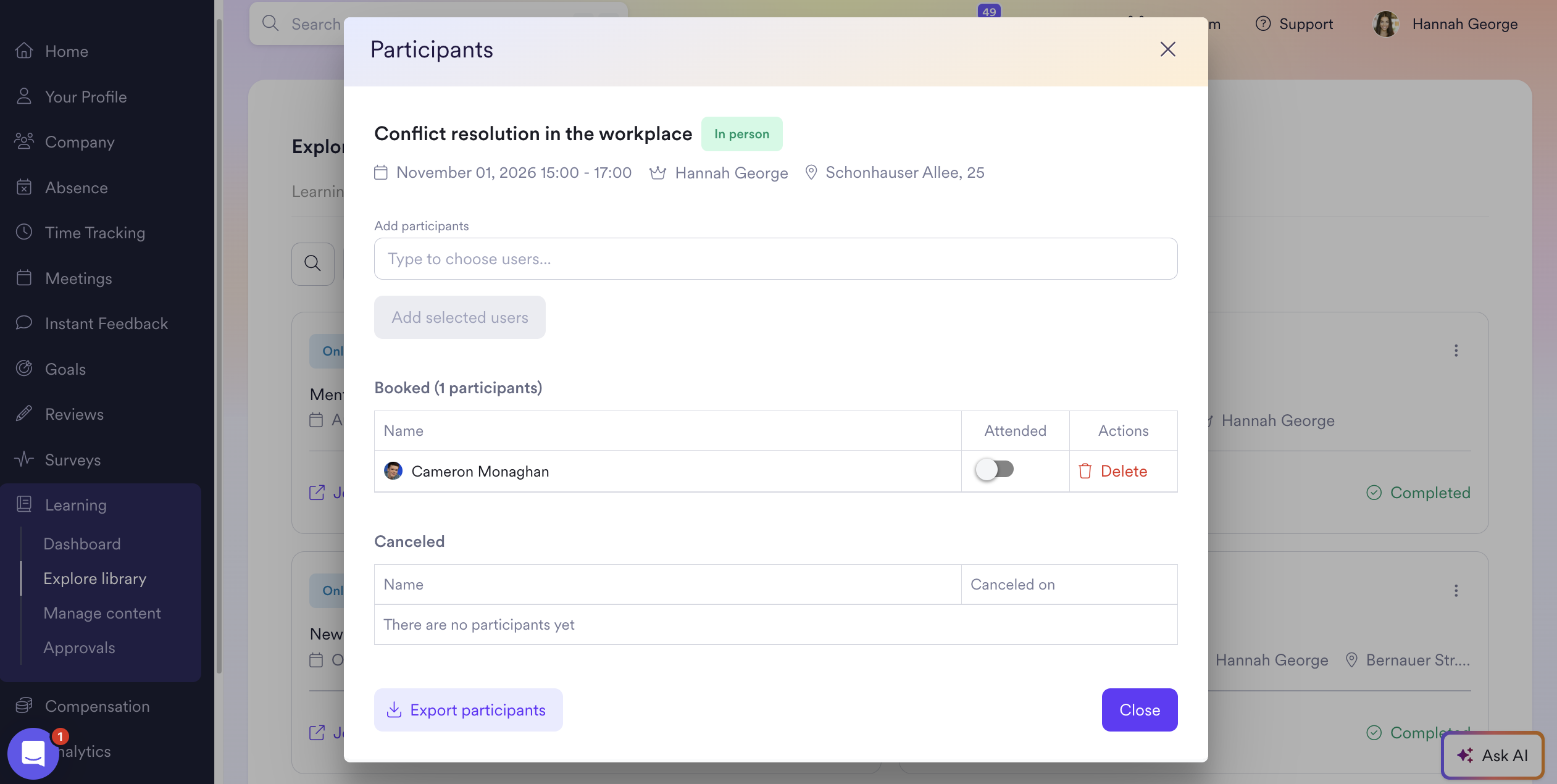 If live training is a mandatory element in a learning path, the user will not be able to continue the path unless an admin confirms their attendance in the 'Manage participants' window.